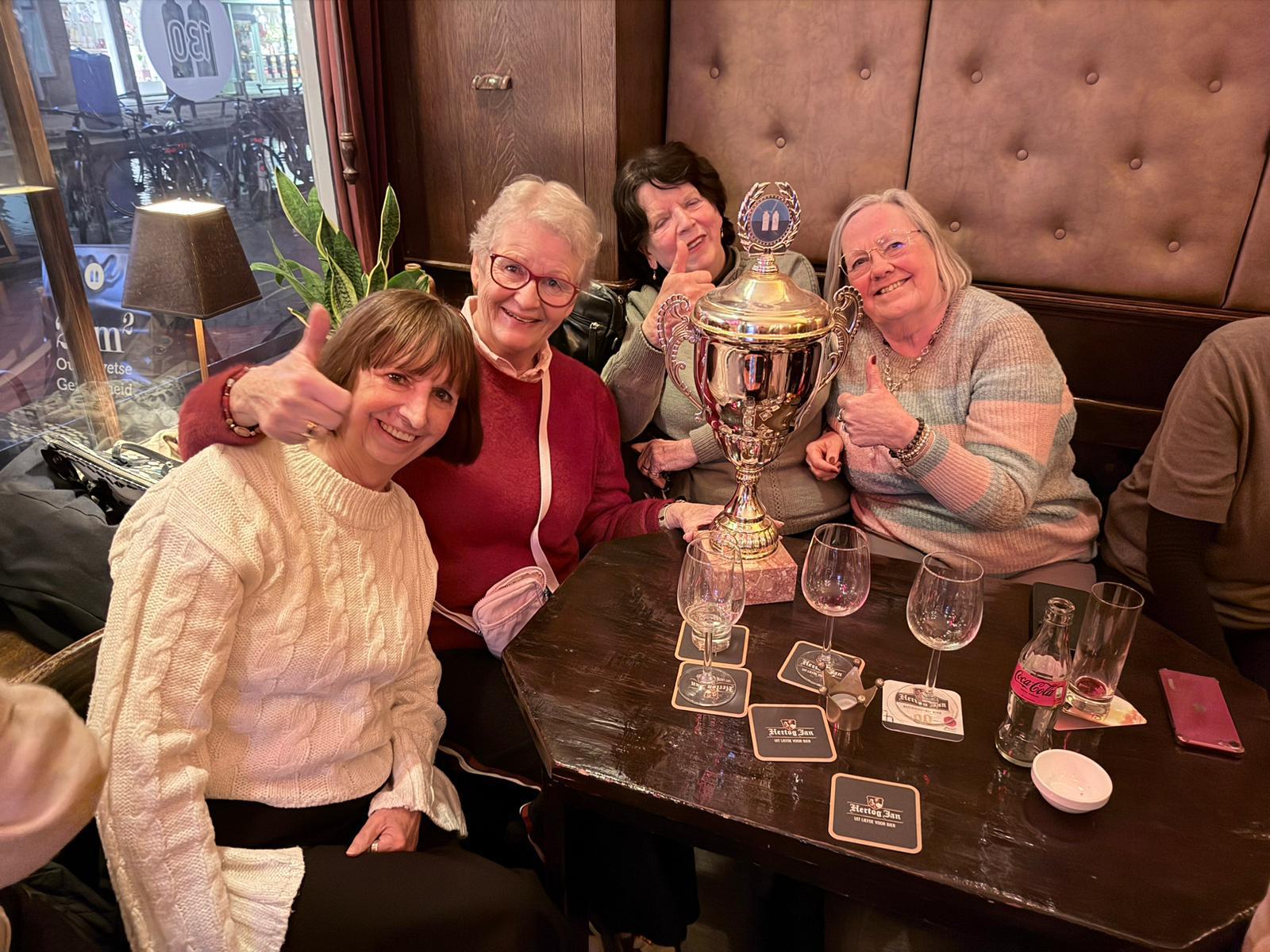 Maar goed op vrijdagavond liep langzaam Café VanOuds vol. Het kleinste café van Delft huisvestte maar liefst eenenvijftig mensen die fanatiek een antwoord op de vragen probeerde te vinden. Telefoons waren verboden dus alles op eigen kracht met aan het einde drie winnaars waaronder het team waar ik bij hoorde. Yeah!! Wij mogen nu vier maanden de wisselbeker meenemen waarna we hem aan het tweede winnende team moeten overhandigen. De derde winnaar, dit keer weer het barteam, mag de laatste vier maanden de beker weer mag hebben zodat we volgend jaar weer met een pubquiz gaan strijden om het winnen van de beker.